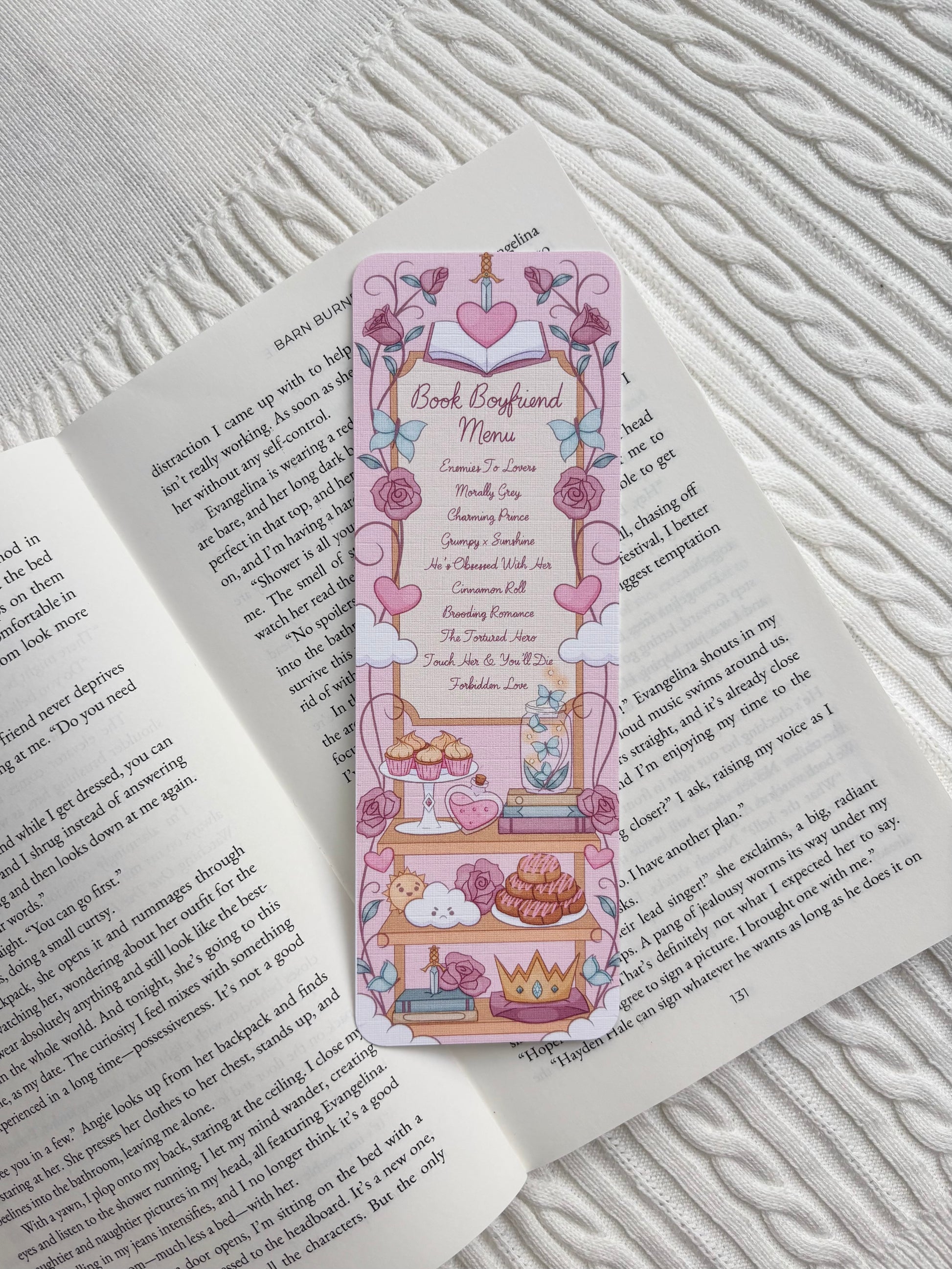 ♡ A fun, unique book boyfriend menu themed bookmark. This bookmark features all your favourite book boyfriend tropes, along with shelves of treats and a menu, mmm delicious! The perfect bookmark for any romance reader & book lover!