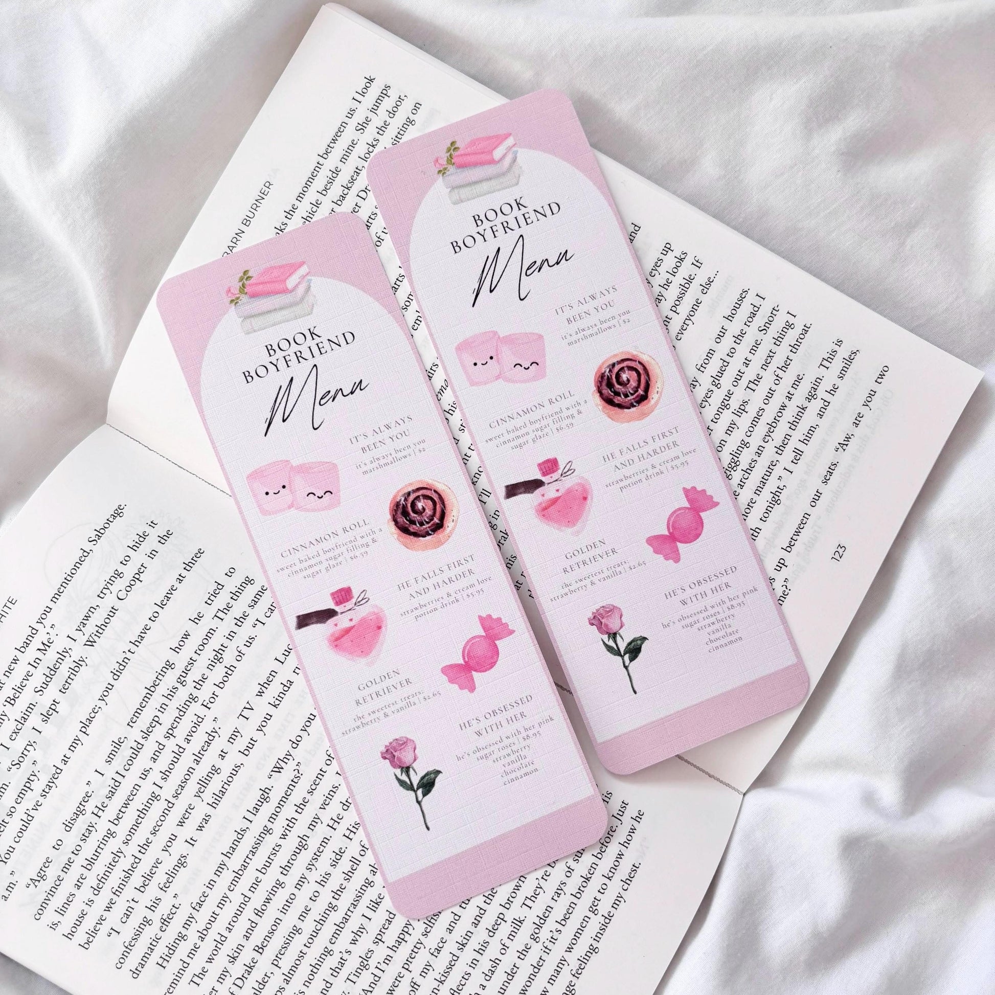 ♡ Sweet pastel pink book boyfriend menu bookmark! A fun bookmark with delicious book boyfriend treats: it's always been you marshmallows, cinnamon roll, he falls first love potion, golden retriever candy & pink sugar roses. The perfect bookmark for any book lover!