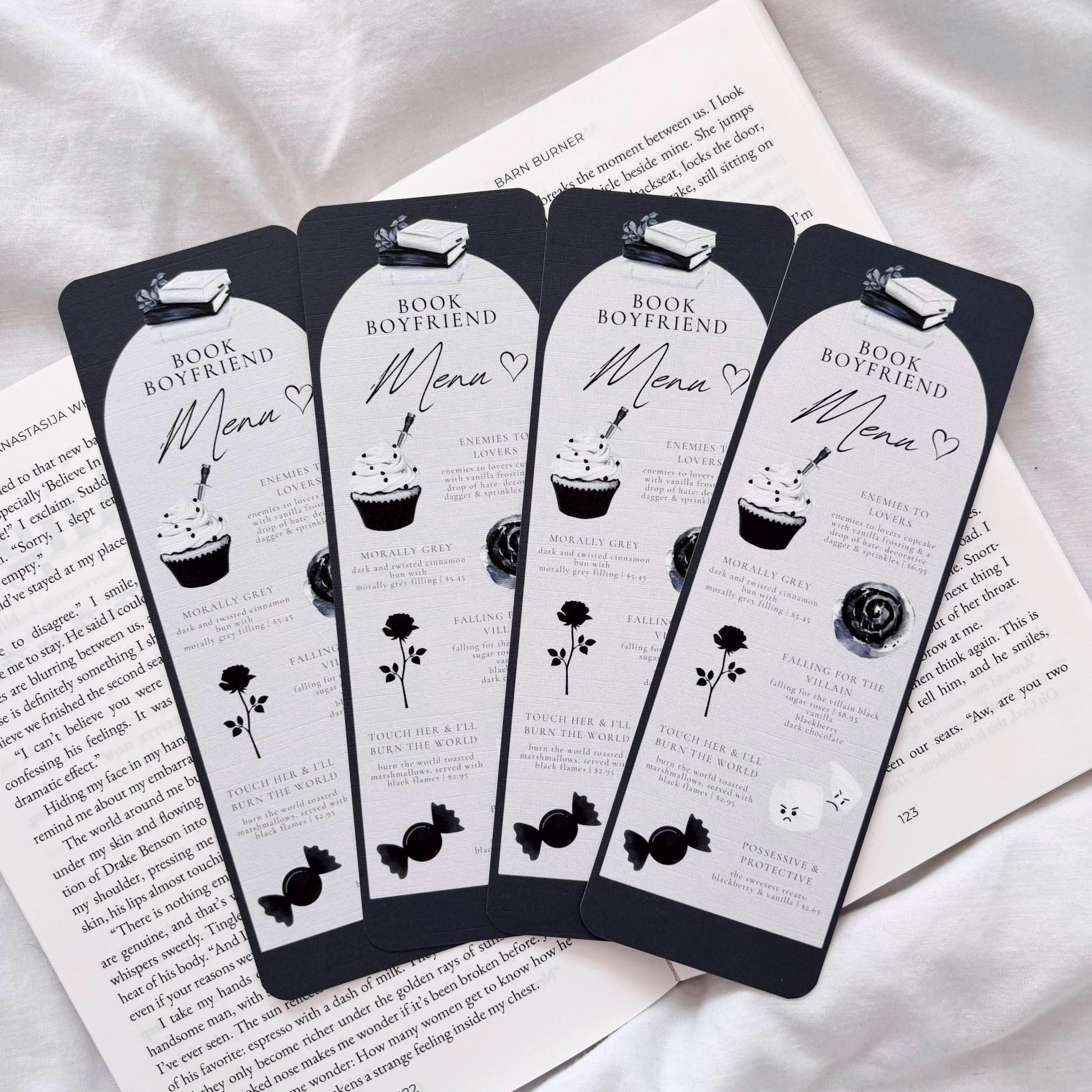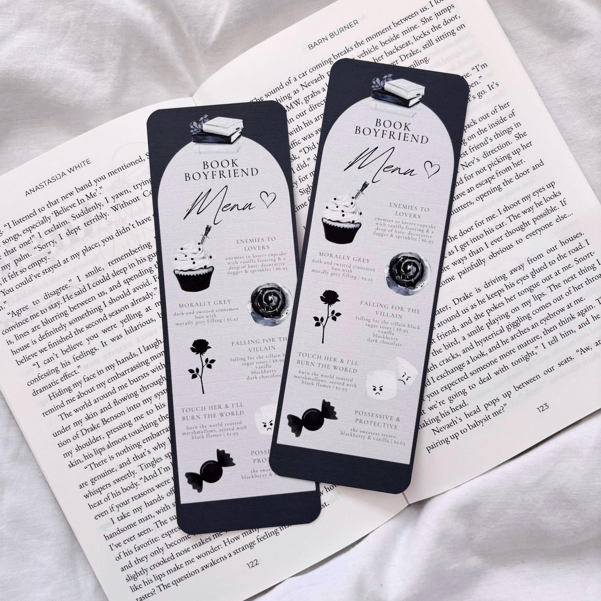 ♡ Dark book boyfriend menu bookmark! A fun bookmark with delicious book boyfriend treats: enemies to lovers cupcake, dark morally grey cinnamon bun, black sugar roses, angry marshmallows and possessive blackberry sweets. The perfect bookmark for any book lover!
