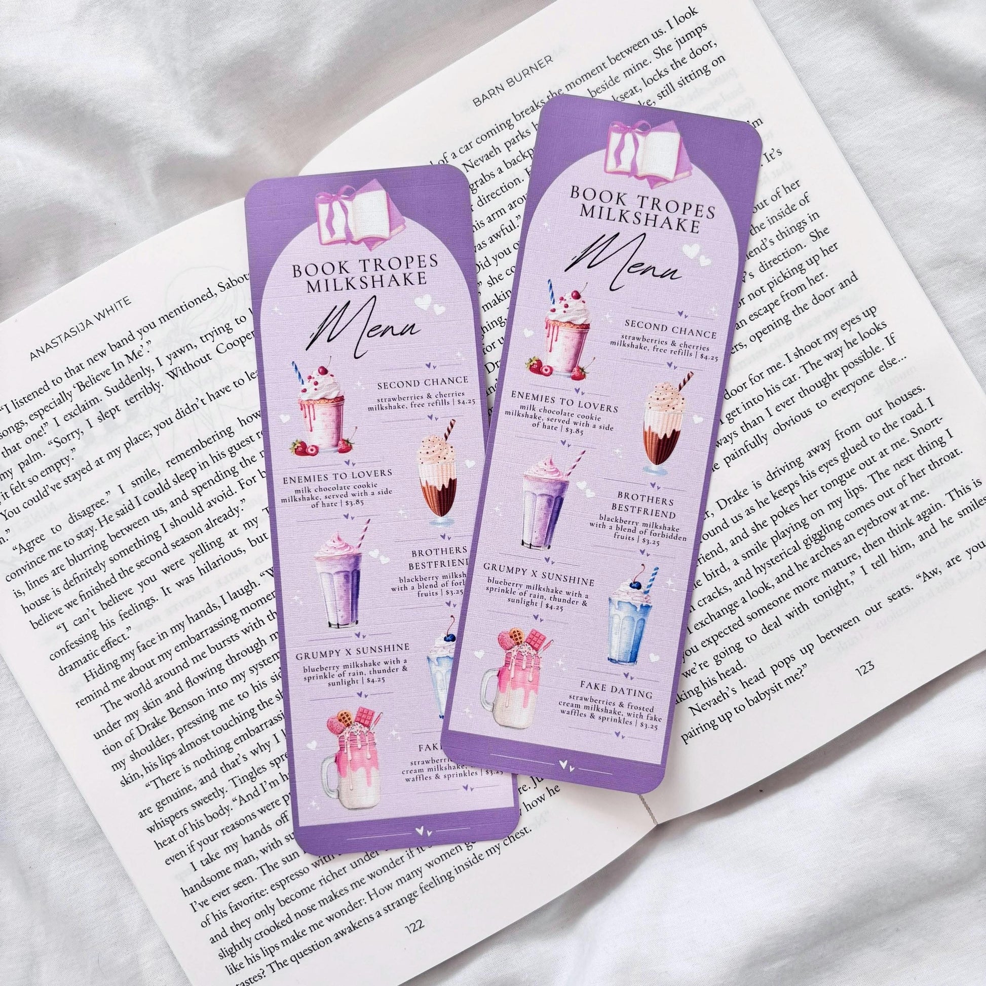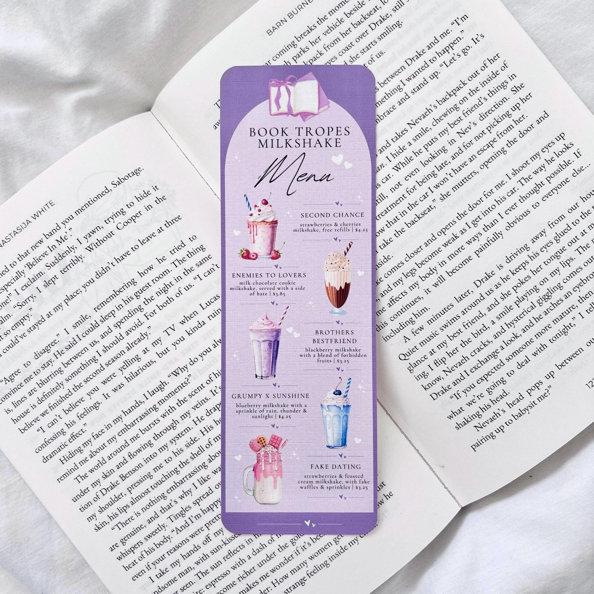 ♡ Book Tropes Milkshake Menu Bookmark! A fun bookish book trope themed bookmark with: second chance, enemies to lovers, brothers bestfriend, grumpy x sunshine and fake dating! The perfect bookmark for any book lover & romance reader.