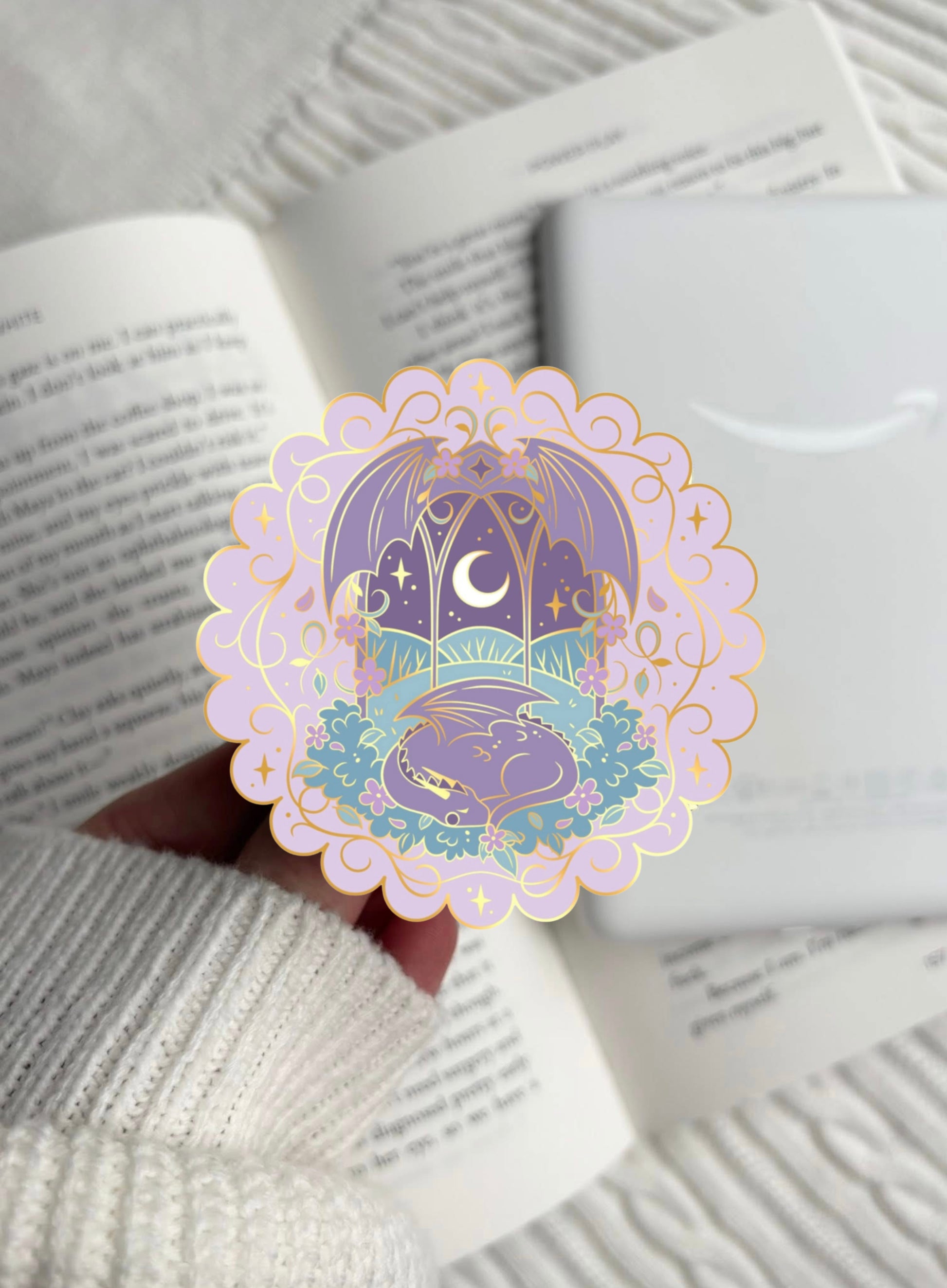 This soft purple E-Reader grip features a whimsical fantasy window with a sleeping dragon curled up at the bottom, along with flowers, gold swirls & sparkles. The most magical grip & perfect for any lover of fantasy, magic and dragons!