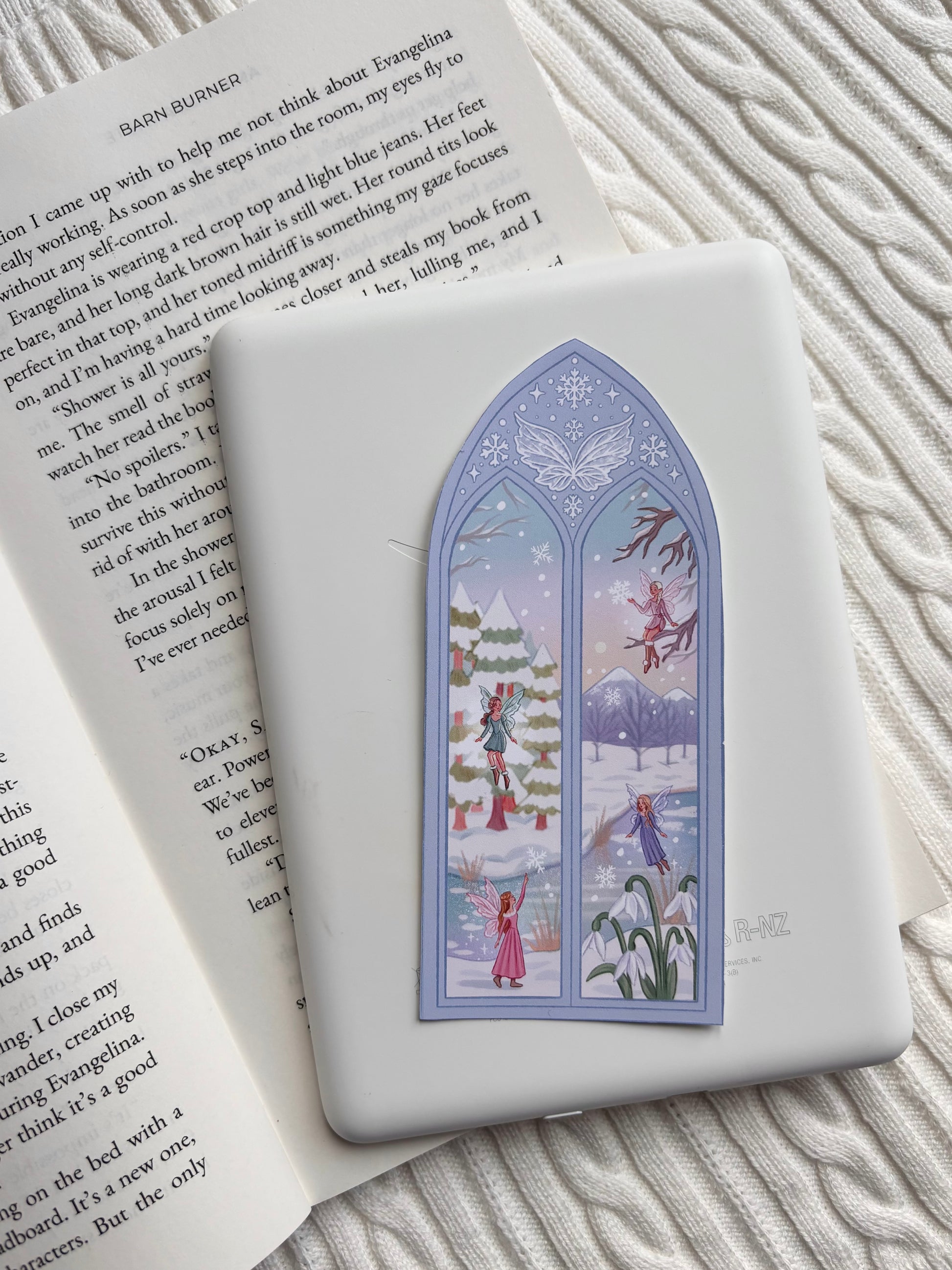 ♡ A winter snow fairy arched window matte vinyl sticker. The perfect sticker for any reader & Christmas lover!